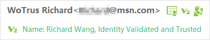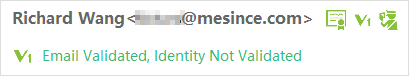As the picture shown on the following figure 1, when the receiver received the email signed by a free V1 signing certificate, MeSign App will display ‘V1 Email Validated, Identity Not Validated’. As the picture shown on the figure 2, when the receiver received the email signed by a V2 signing certificate, MeSign App will display ‘V2 full name, Identity Validated’. As the picture shown on the figure 3, when the receiver received the email signed by a V3 signing certificate, MeSign App will display ‘V3 Organization Name, Identity Validated and Trusted’. As the picture shown on the figure 4, when the receiver received the email signed by a V4 signing certificate, MeSign App will display ‘V4 Full name, Organization Name, Title, Identity Validated and Trusted’.
