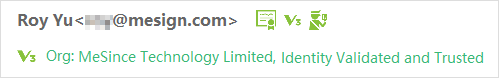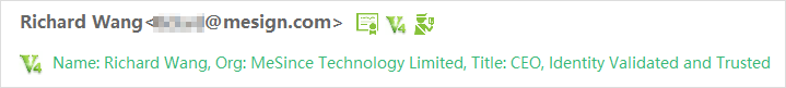 However, the email signature service pro provides user to use the signing certificate (V2/V3/V4 signing certificates) which contains the sender’s validated identity information to send signed emails. Once the receivers receive the signed email, MeSign App will display senders’ identity information according to the information on the signing certificate.