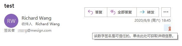 如下图所示,同一封数字签名邮件,左边为Outlook显示的签名信息-“该数字签名是可信的”,而右边是密信App展示的签名者可信身份信息-“身份真实可信,数字签名全球信任”。