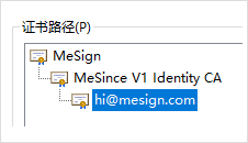 如下图所示,左图为密信信任的免费自动配置的密信V1签名证书的证书链,其顶级根证书为MeSign (MeSince Identity CA)。中图为全球信任的密信Vp邮件证书证书链,其顶级根证书为Sectigo (USERTrust RSA Certification Authority)。右图为签发证书的中级根证书(MeSince Secure Email CA)的证书链,由全球信任的顶级根证书Sectigo (USERTrust RSA Certification Authority)签发。
